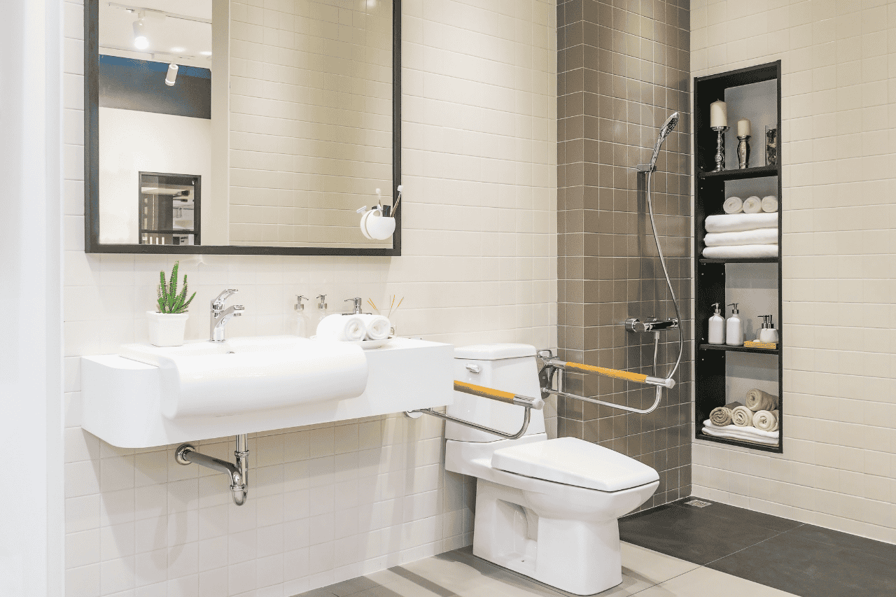 Safe, accessible bathrooms designed for individuals with mobility challenges, featuring walk-in showers, grab rails, and non-slip flooring.